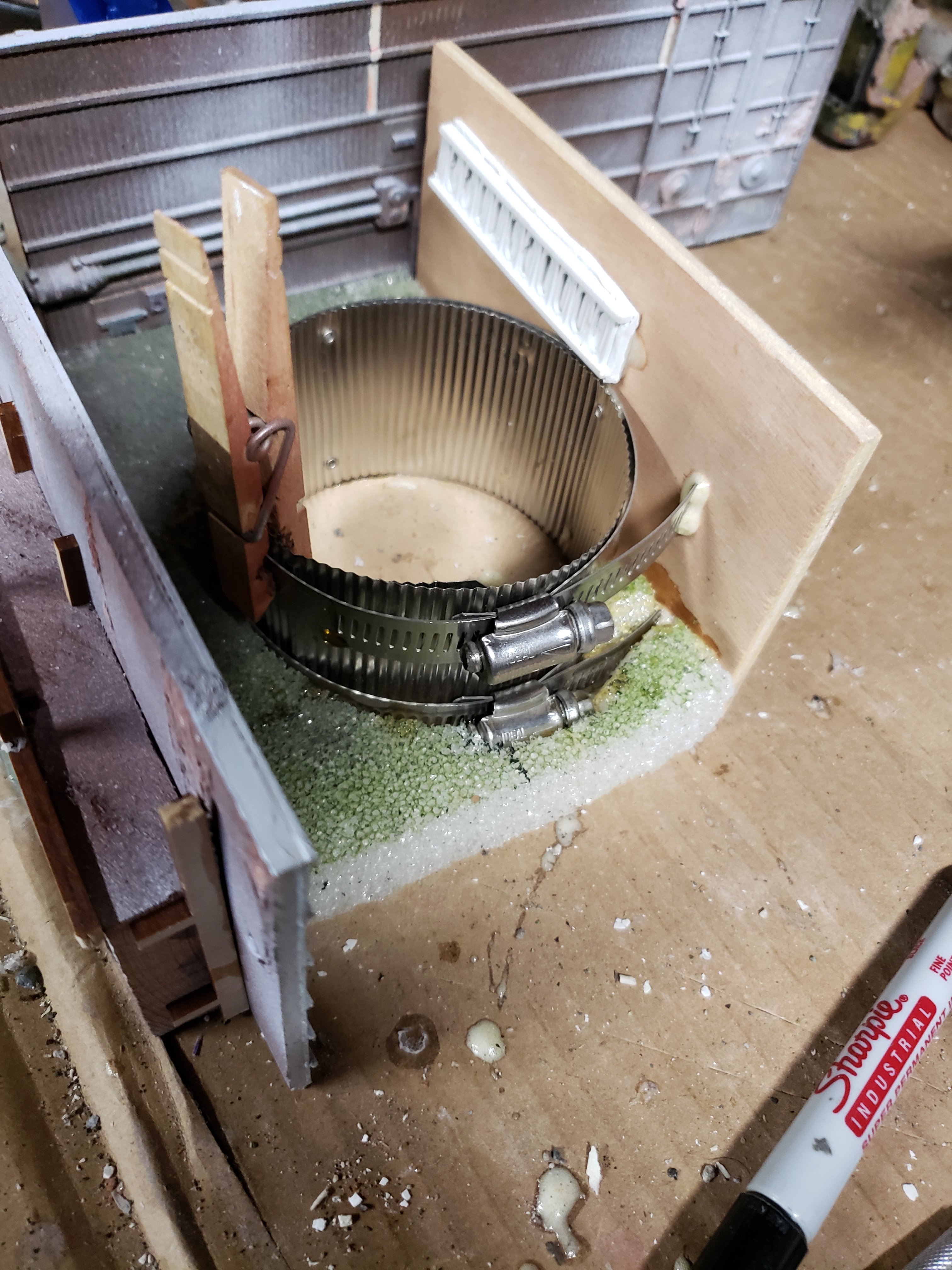 Progress on the #vault I added plaster and sand, and rigged a cast resin cog hinged up with some leftover laser cut scraps. Gave it a quick once over with paint and some flock. I’m pretty stoked with how well its come together for a basically 2 day build! #terrain #fallout #trashbash #kitbashing